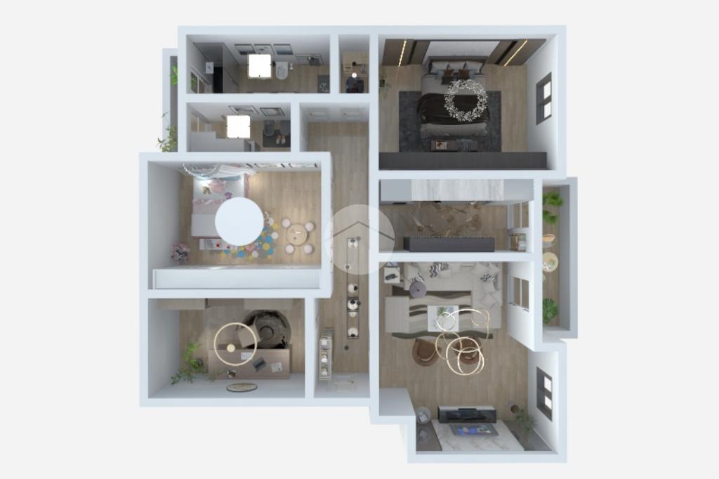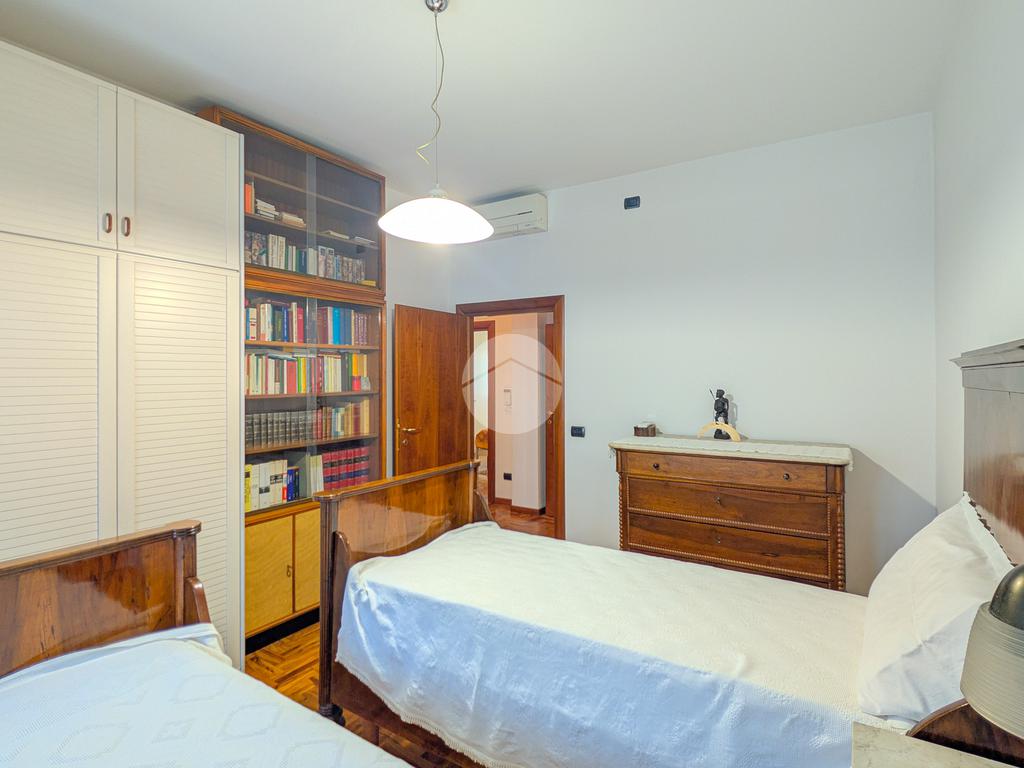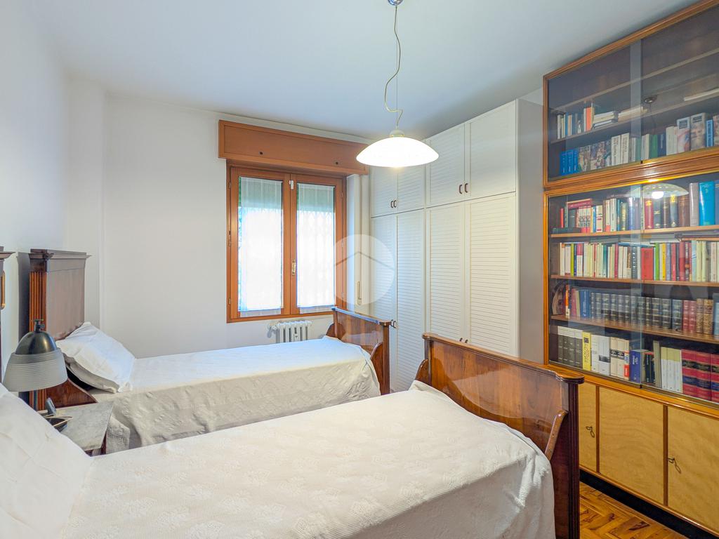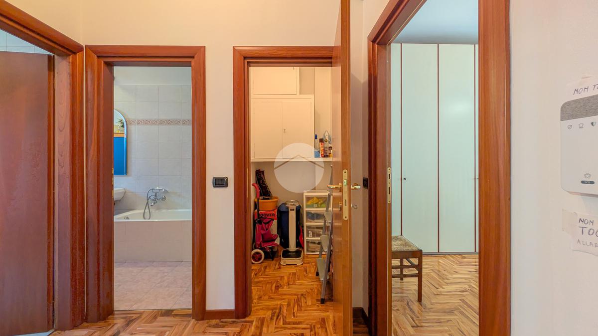 La zona notte, ben disimpegnata, comprende due camere matrimoniali e una cameretta/studio, tutte dotate di finestre e ottima esposizione. Due bagni finestrati, entrambi moderni e finemente rifiniti, con accesso al secondo balcone, e un comodo ripostiglio completano la distribuzione interna.