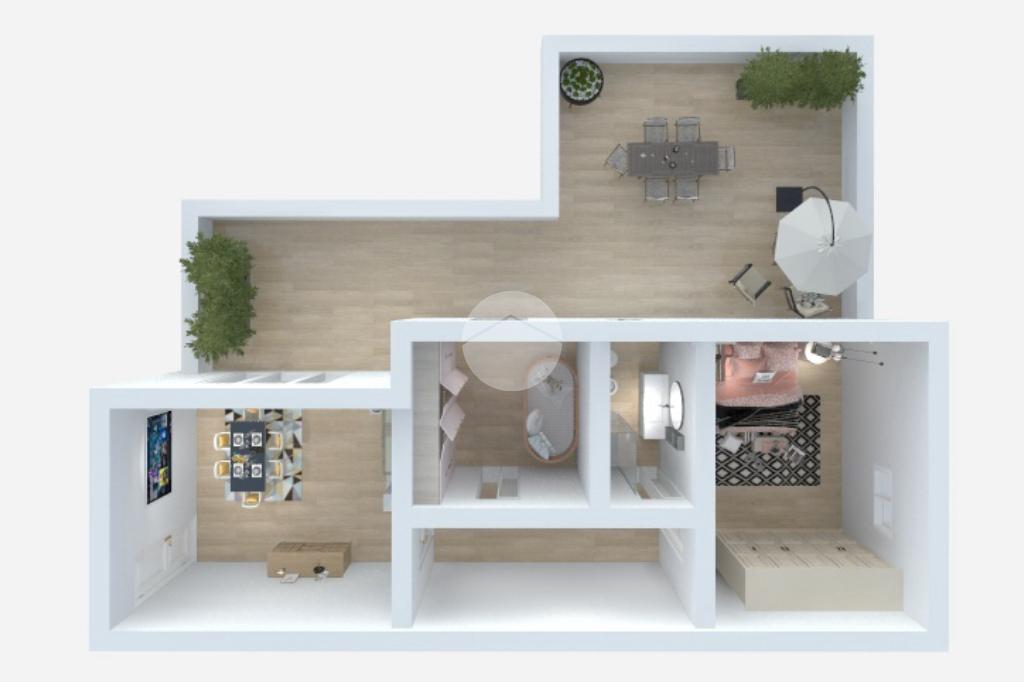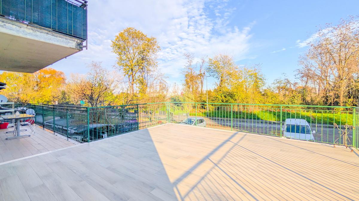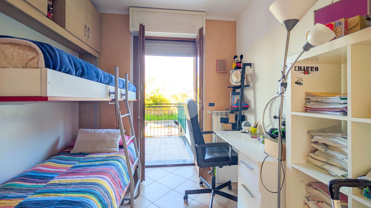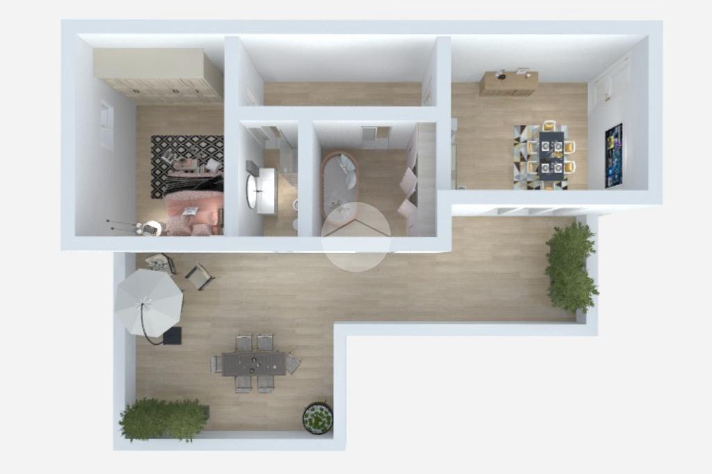 L’ingresso si apre su un luminoso soggiorno con cucina a vista, con accesso diretto a un ampio terrazzo vivibile di circa 50 mq, ideale per pranzi all’aperto e momenti di relax. Proseguendo lungo il corridoio troviamo una prima cameretta con porta finestra, anch’essa con accesso al terrazzo, un bagno finestrato con doccia e una camera matrimoniale, anch’essa luminosa e ben arieggiata.