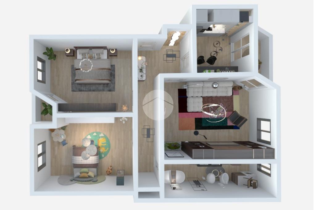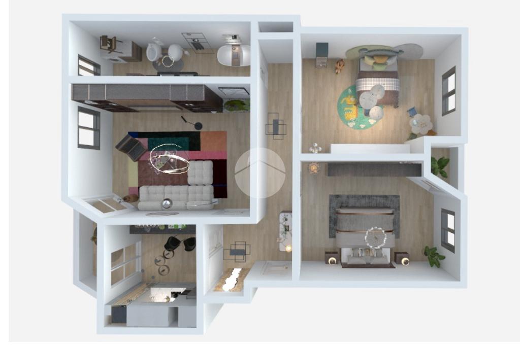 Sulla destra si sviluppa la zona notte, composta da due camere da letto, ben proporzionate e facilmente arredabili.