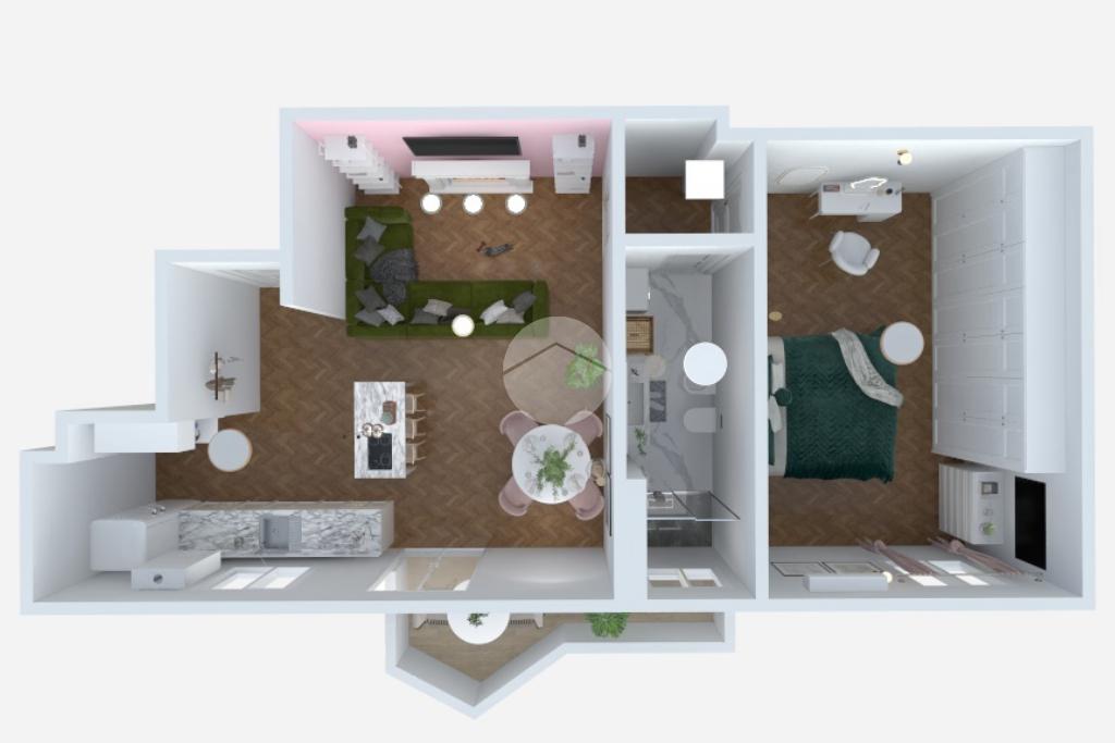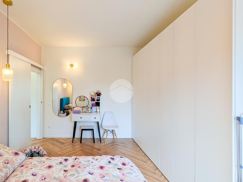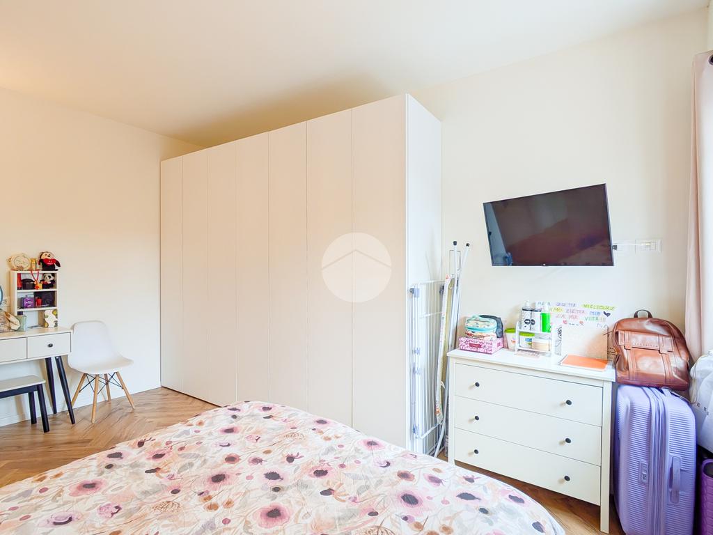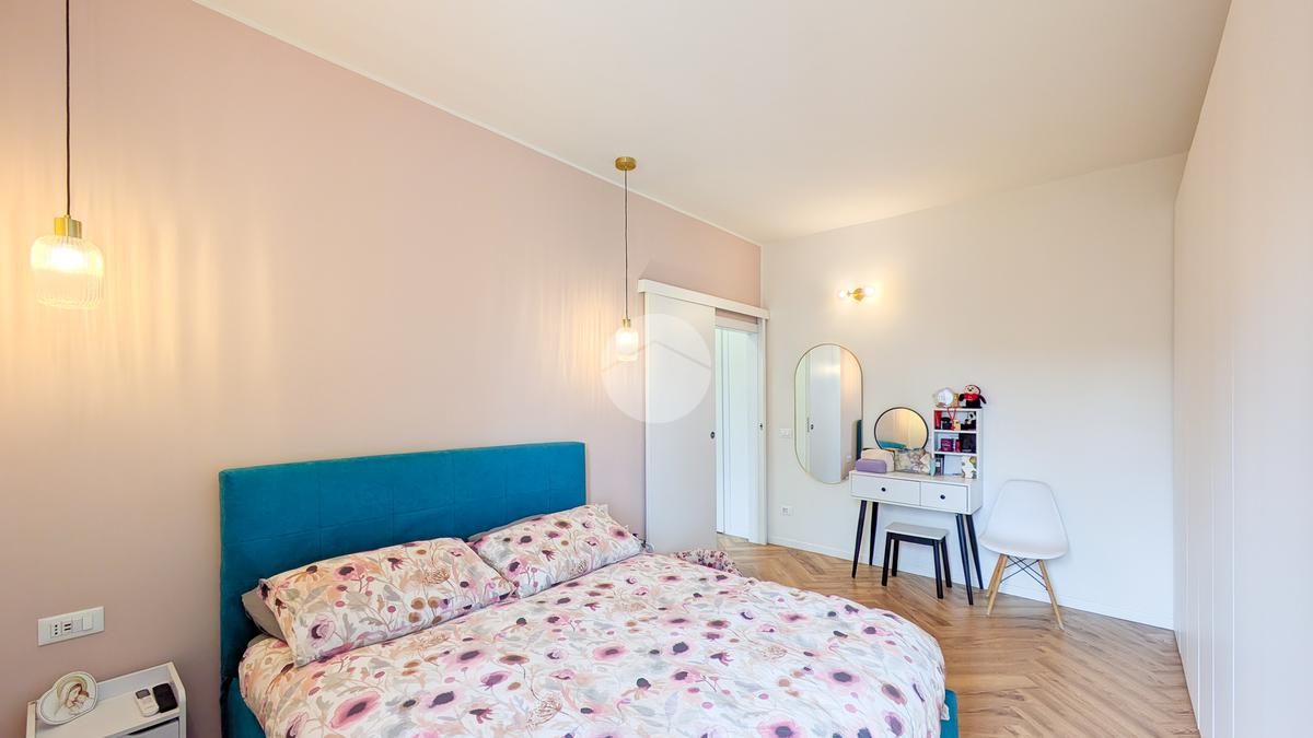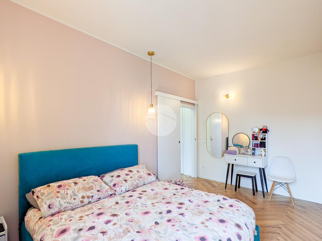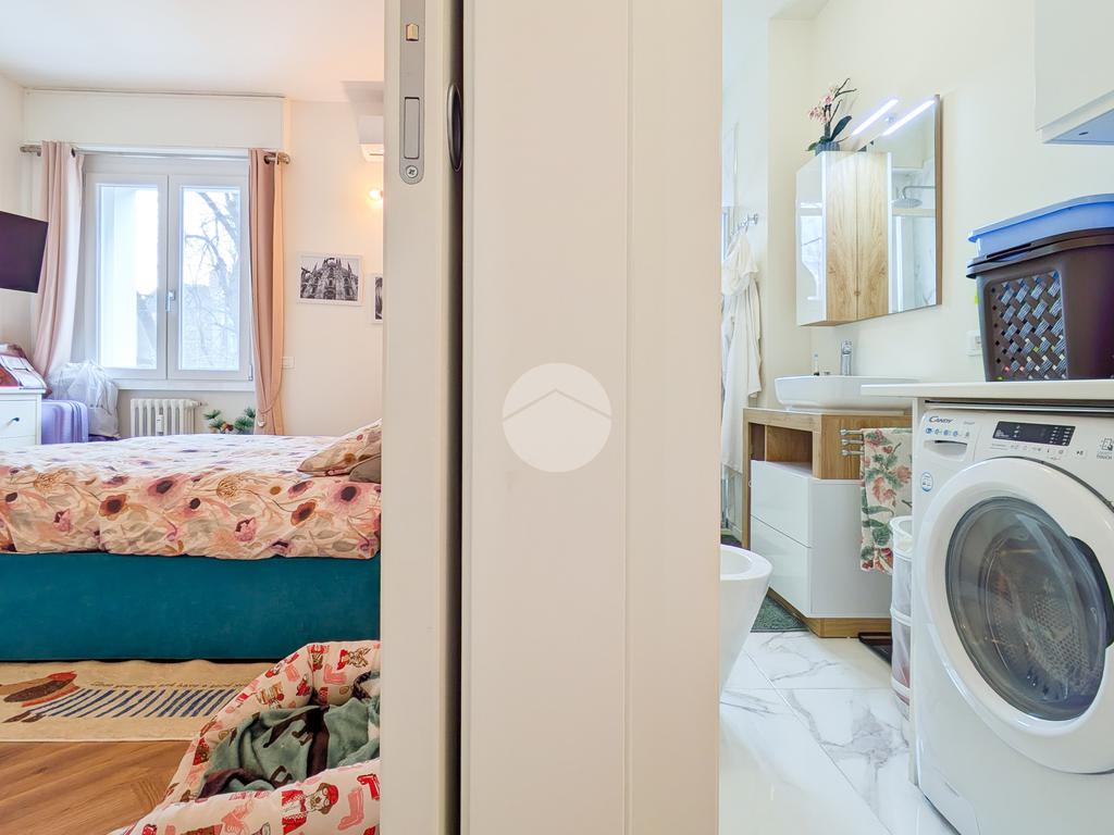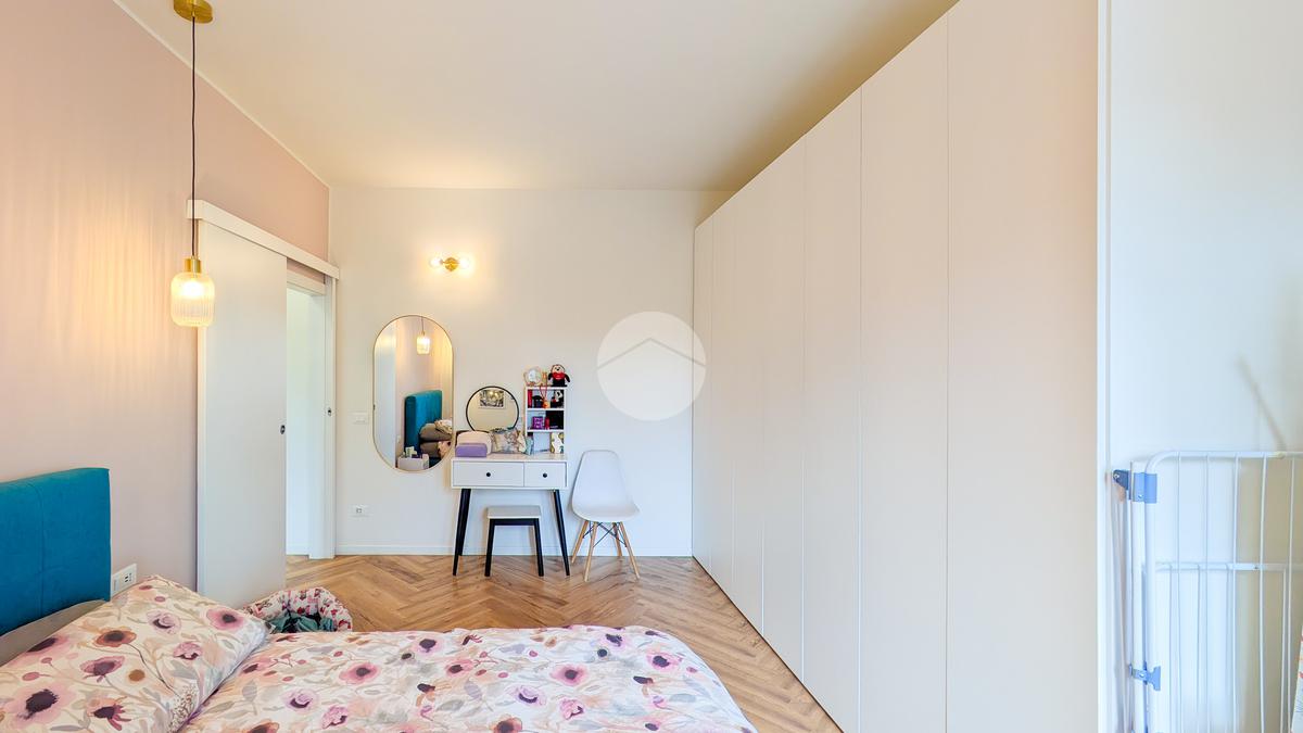 La zona notte è un rifugio di stile, con un letto matrimoniale contenitore coordinato agli arredi del living, armadiature su misura e una zona trucco dedicata. Il bagno, un vero spazio benessere, vanta finiture in marmo, una spaziosa doccia walk-in e un’area lavanderia con mobili dedicati. Ogni centimetro è stato ottimizzato, come dimostra l'armadio su misura nell'antibagno.