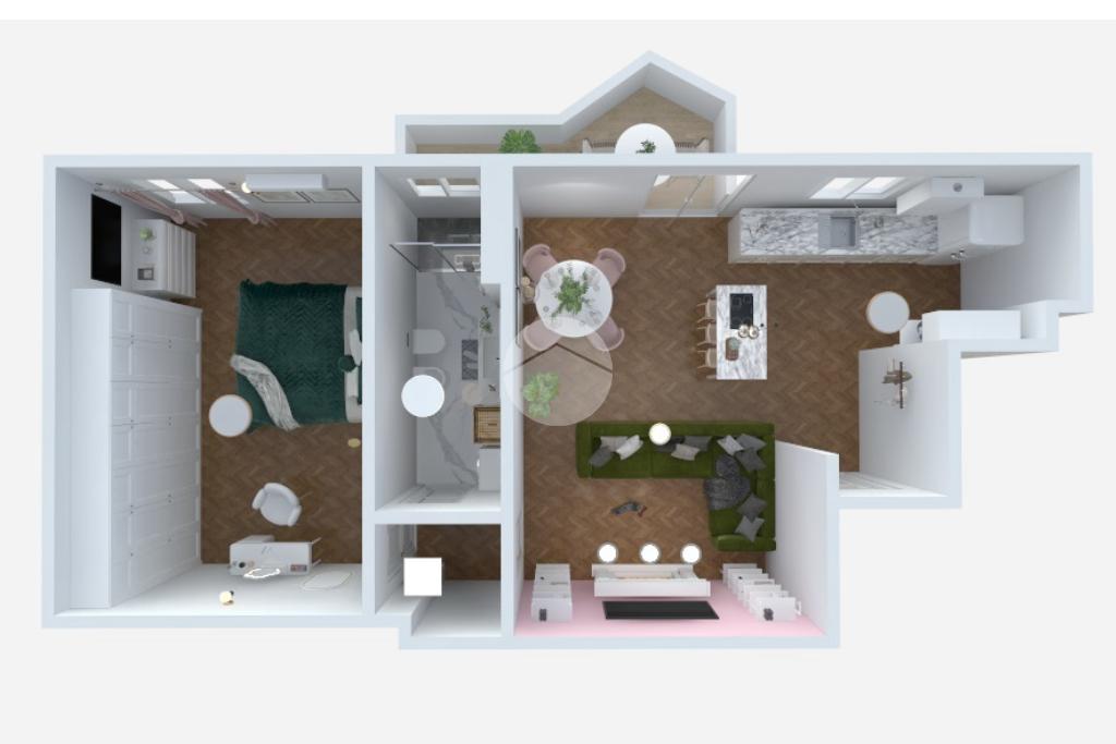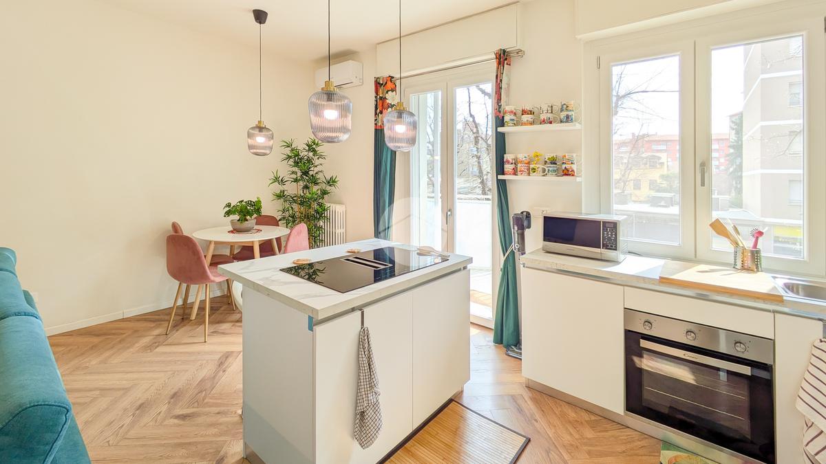 Il design interno è dominato da un raffinato parquet a lisca di pesce che esalta la pièce de résistance della casa: una cucina su misura con una splendida isola centrale. Quest'ultima ospita un piano cottura a induzione con cappa ad aspirazione integrata di ultima generazione, un dettaglio tecnologico che elimina ingombri visivi e garantisce massima pulizia. La cucina è dotata di tutti gli elettrodomestici Candy (forno, frigo, lavastoviglie), inclusi nella vendita. Il soggiorno, luminosissimo grazie all’esposizione a Sud, offre un ampio divano letto contenitore realizzato su misura e un suggestivo camino elettrico, il tutto incorniciato da applique di design e una moderna striscia a LED.